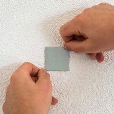 Haal de hexagon terug van de muur en duw het plaatje tegen de muur stevig aan.